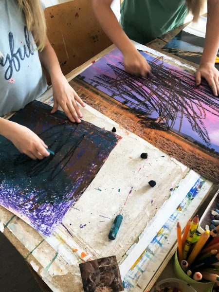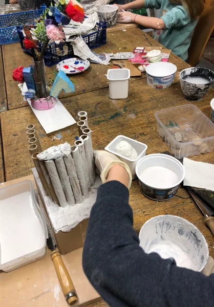 Ein gemeinsames Abenteuer durch die Welt der Materialität: Die Kinder lernen neue Techniken zur Ideenfindung kennen und arbeiten mit verschiedenen Zeichen- und Skulpturmaterialien oder setzen recycelte Materialien kreativ ein.
